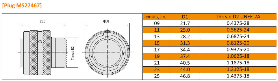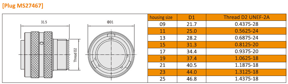 Dimension pour Amphenol MIL-DTL-38999 Série I standard militaire JY27467 Militaire Connecteurs circulaires